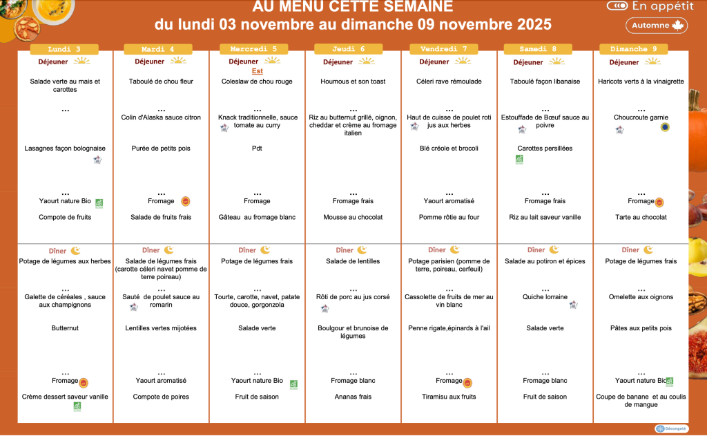 Menus de la semaine du 3 novembre 2025 au 9 novembre 2025, c’est le cycle Automne !