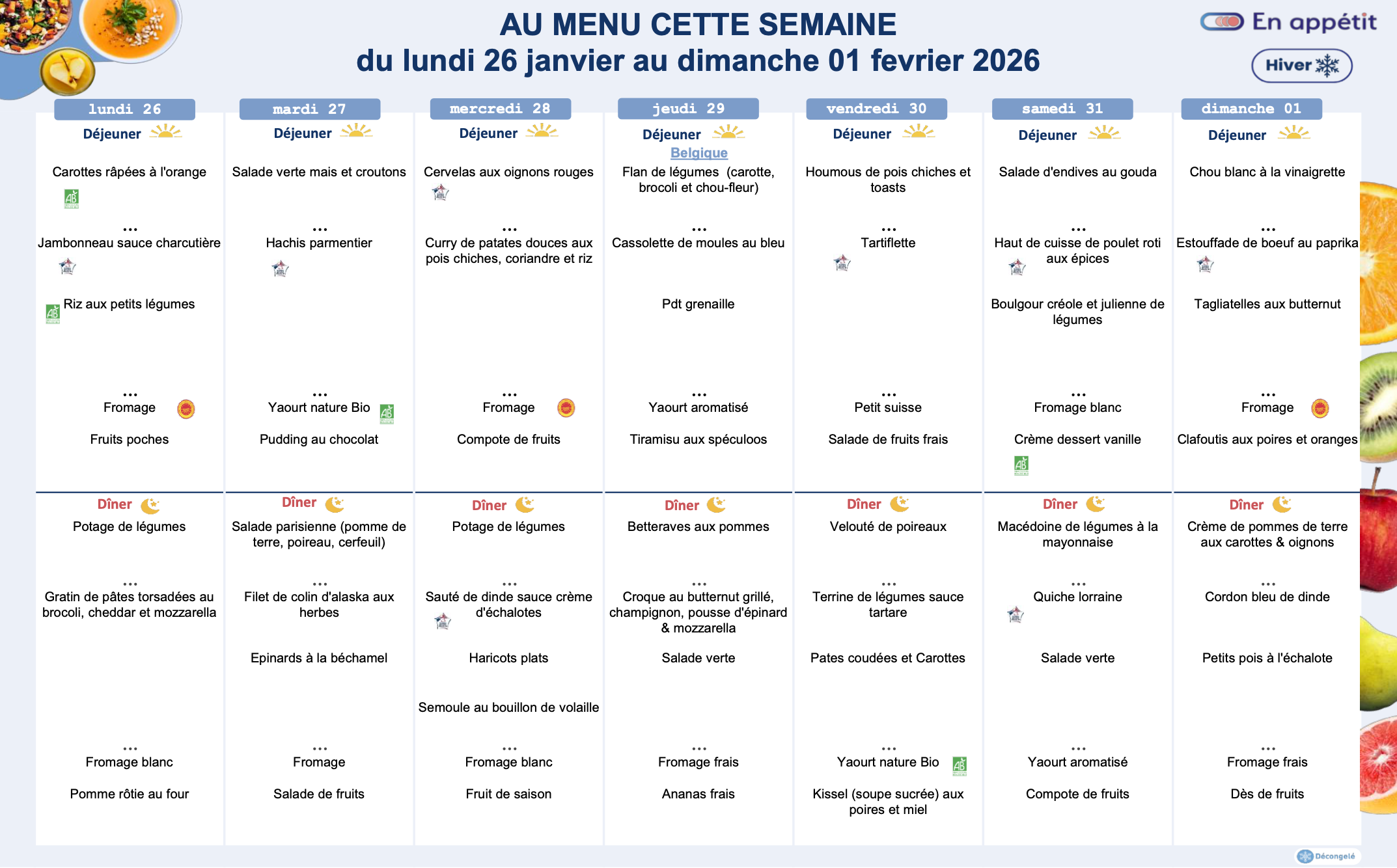 Menus de la semaine du 26 janvier 2026 au 1er février 2026: le cycle Hiver a commencé le 15 décembre !
